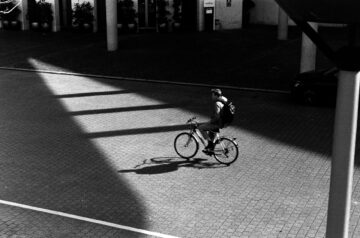 Mathias Paessler Warten bis ein Fahrradfahrer kommt Fotograf: Mathias Paessler Motiv: Vor dem Konzerthaus Freiburg Kamera: Leica IIIf Objektiv: Canon 50mm f1.8 LTM Film: Fomapan 200, ISO 200 Filmentwicklung: Jobo Alpha (1+1+18) 12 Min Digitalisierung: BlackBox135 / Leica M246 Monochrome Software: Negative Lab Pro „Das Foto wurde an einem sonnigen Vormittag im März d....